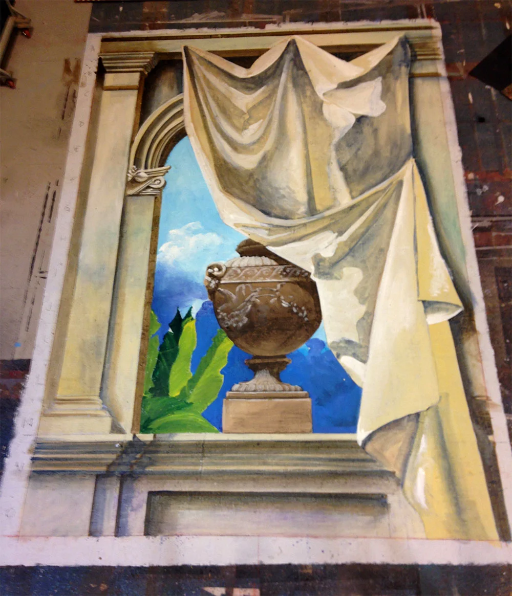 I primed an appropriate area on the floor and used snapped lines and 3-4-5 triangles to make a true 10'x16' rectangle. Then I created a one-foot grid and used this to make a cartoon of the image with charcoal. The paint was applied in various washes working from back to foreground.